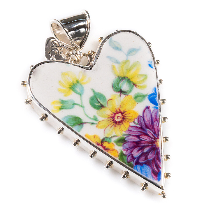 Hjärtat är skuret ur gammalt porslin och har sedan fått en infattning runt kanten av silver, med små silverkulor fästa som dekor runt kanten. En härlig bukett i klara färger på rent vit botten.